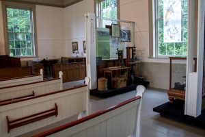 J’ai pris le chemin vers le Musée Eaton Corner sans trop savoir à quoi m’attendre. Un musée, c’est un musée, non? Eh bien, à Cookshire-Eaton, il n’y a rien d’ordinaire! Je me stationne devant une vieille église et je doute de mon GPS un instant, mais je suis pourtant au bon endroit : le musée Eaton-Corner est situé dans une église congrégationaliste datant de 1841. On y retrouve même encore les bancs au centre des panneaux d’exposition. À leurs pieds se trouvent des douzaines d’artéfacts sur l’histoire des premiers colons de la région du Haut-Saint-François arrivés à la fin du 17e siècle.